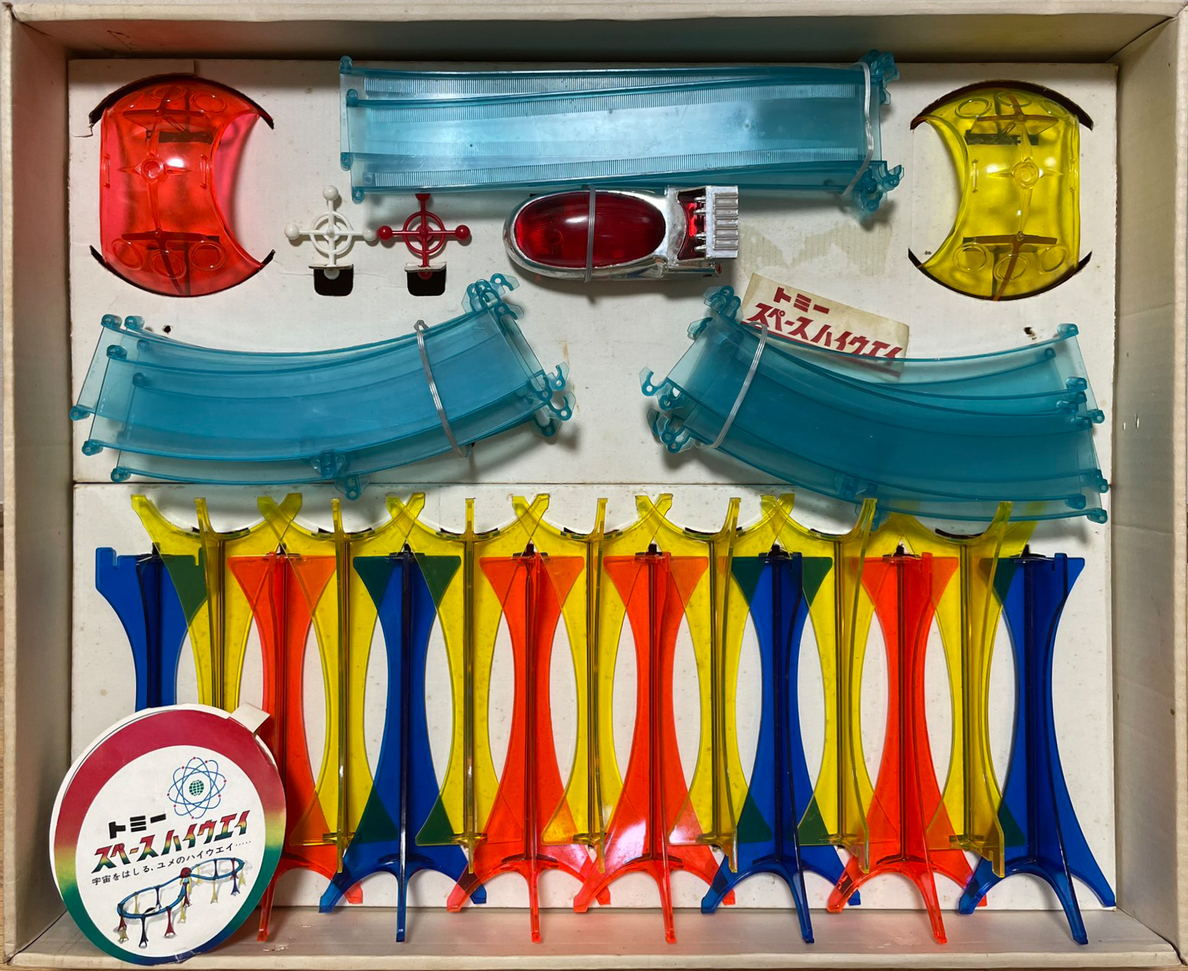 橋脚はクリア成型の青色・黄色・オレンジ色の3色、道路もクリア成型です。レイアウトは8の字で、箱のイラストの通り、交差点にはドームが設けられジャンクション的な役割を担っている設定だと思われます。特に発展したわけでもなく、スペースハイウェイ系はこのセットのみの存在のようです。