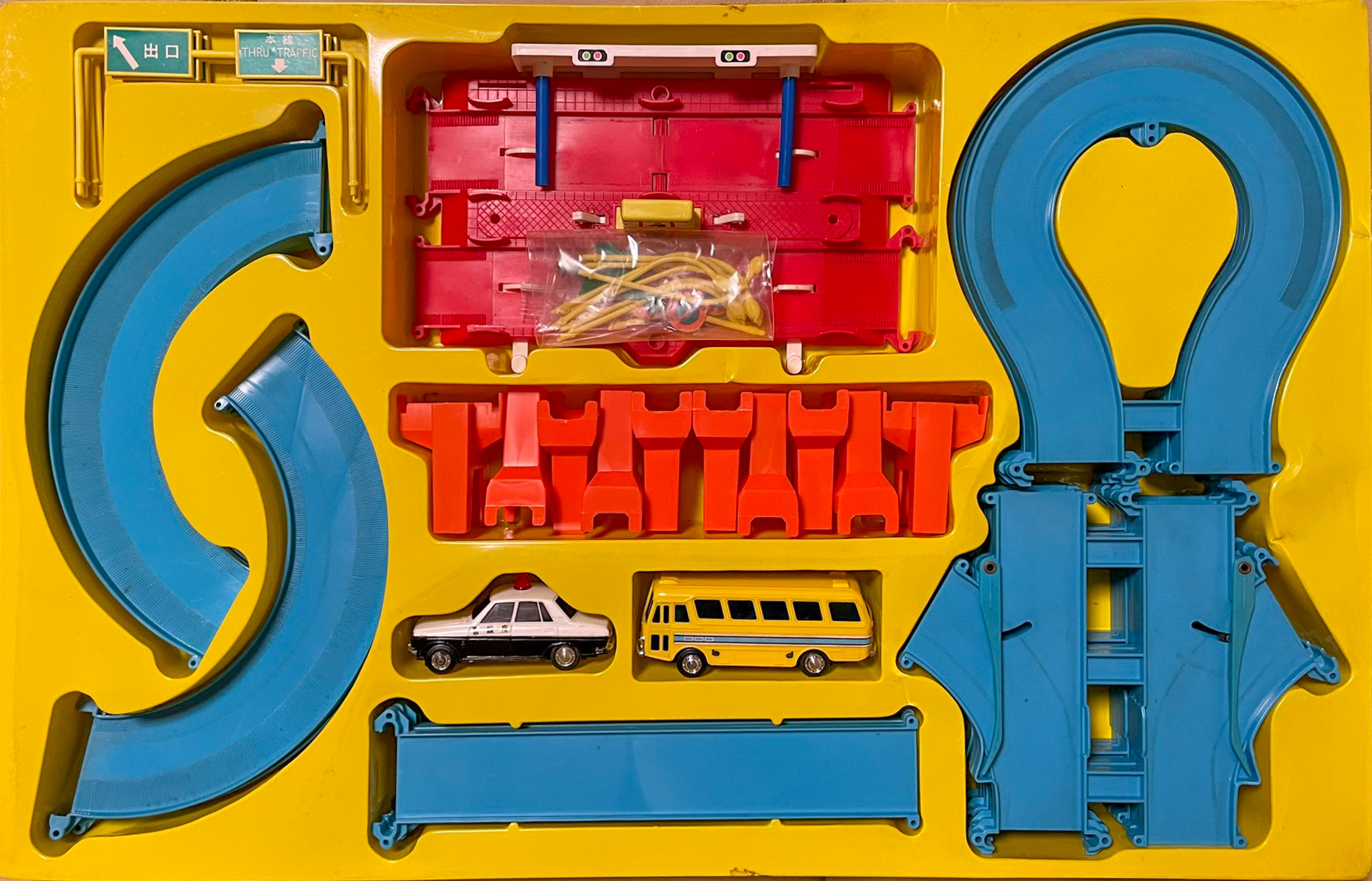 箱イラストの料金所が黄色いタイプで描かれていますが、これは1969年頃に発売されていた「ダブルハイウェイ」のもの。見ての通り、このセットでは赤いものになっています。バスは下に掲載しているプラレールの「ハイウェイターミナルステーションセット」にも入っています。