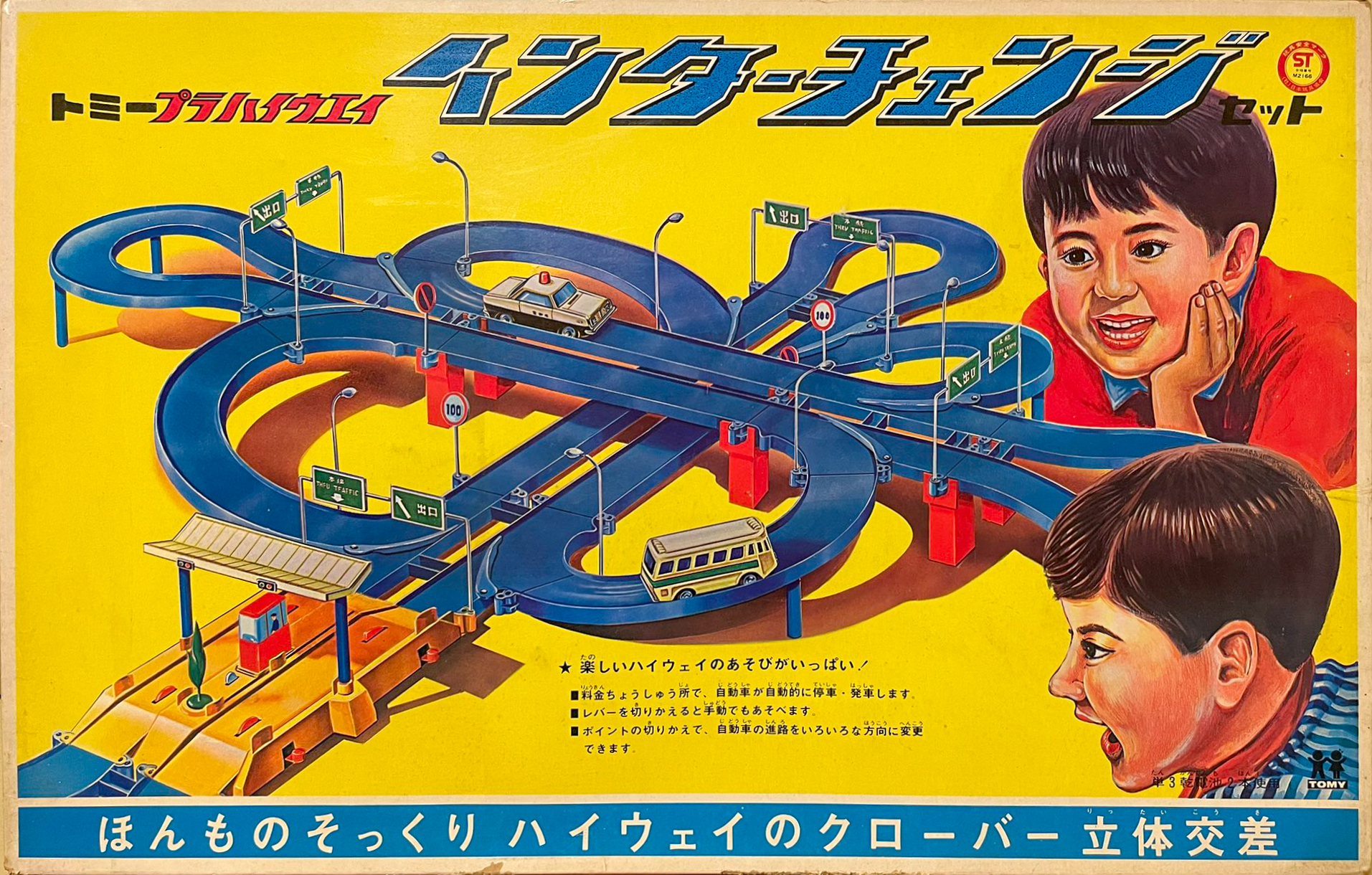 料金所を通過し、インターチェンジを通ってハイウェイに乗り入れる遊びが出来るセット。パトカーブルーバードとハイウェイバスが入り、2台走行が楽しめます。