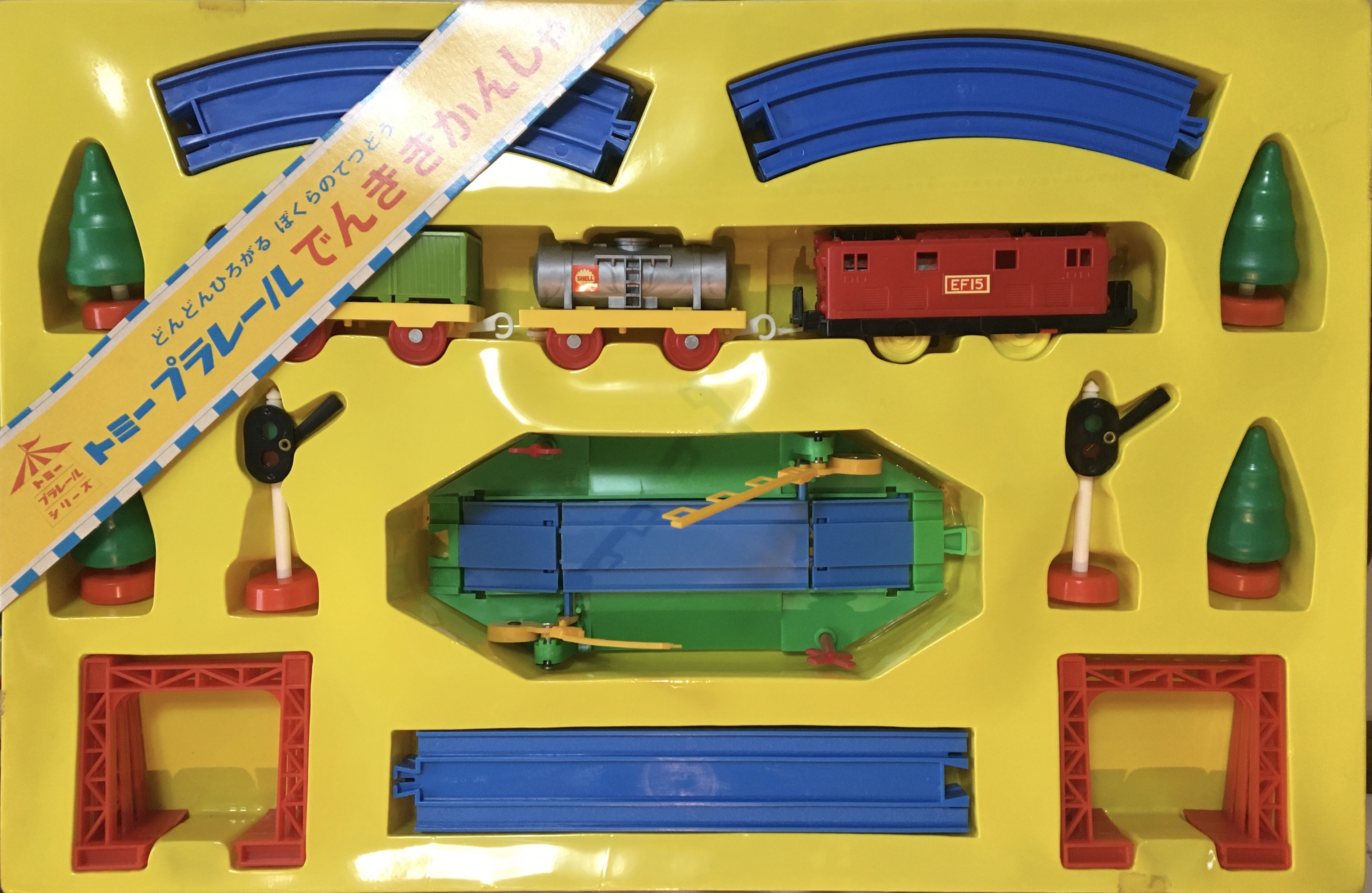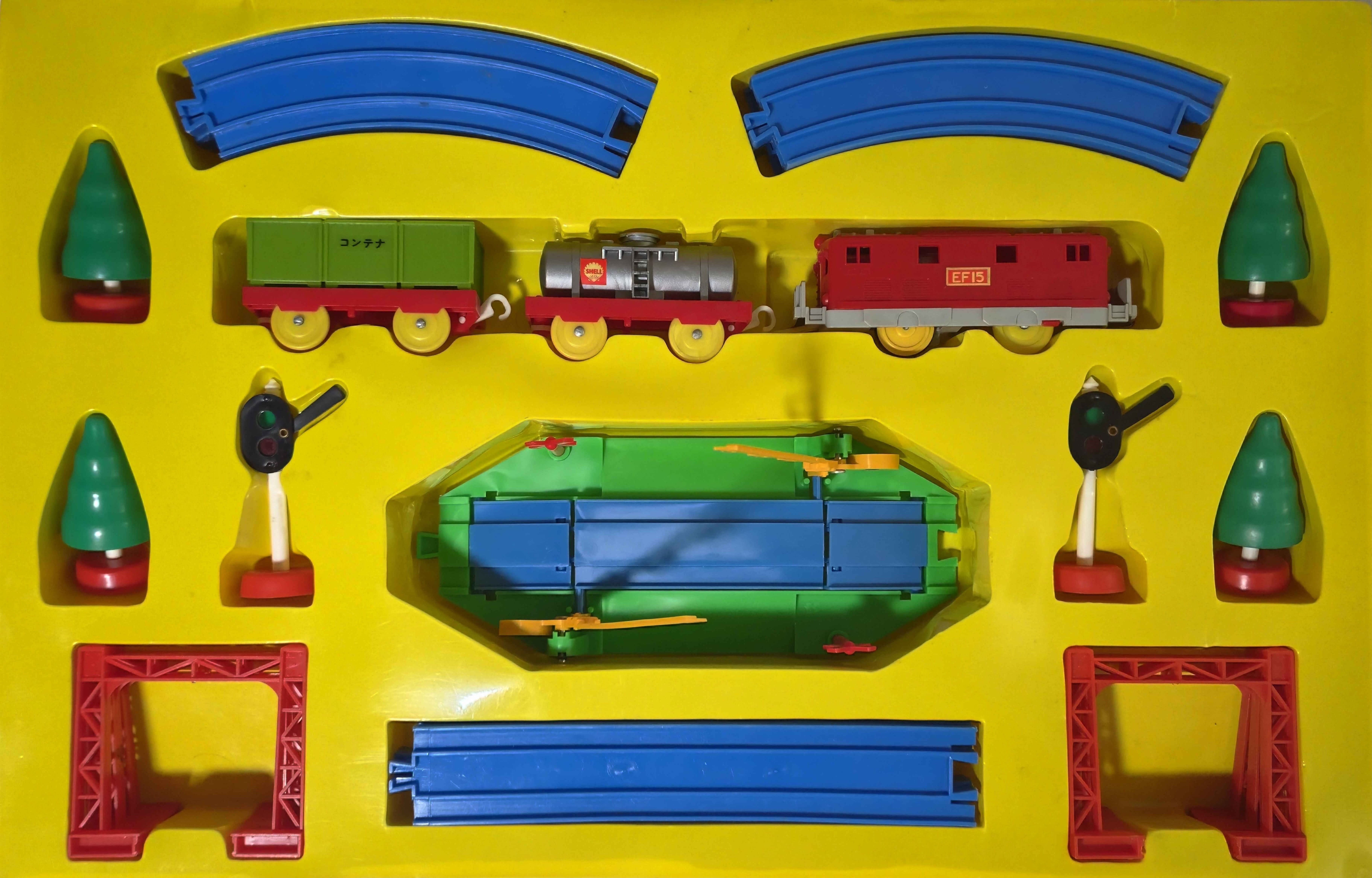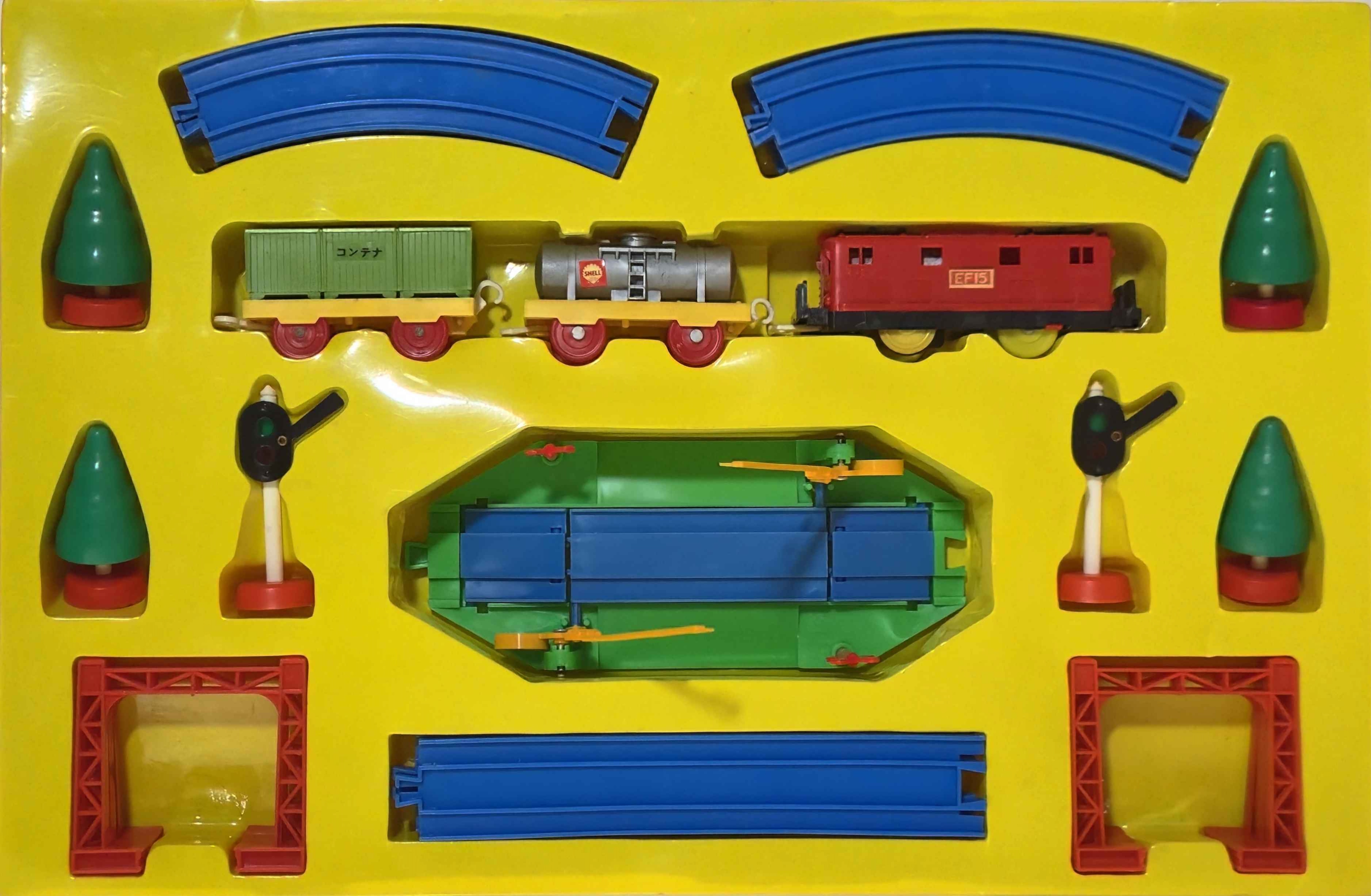 同年発売の新製品「でんききかんしゃ」のセット。赤いEF15が貨車を牽引するベーシックなセットです。単品同様、最初期生産品はグレー台車のEF15に赤台車の貨車、のちに黒台車のEF15に黄色台車の貨車に車両が変わっています。