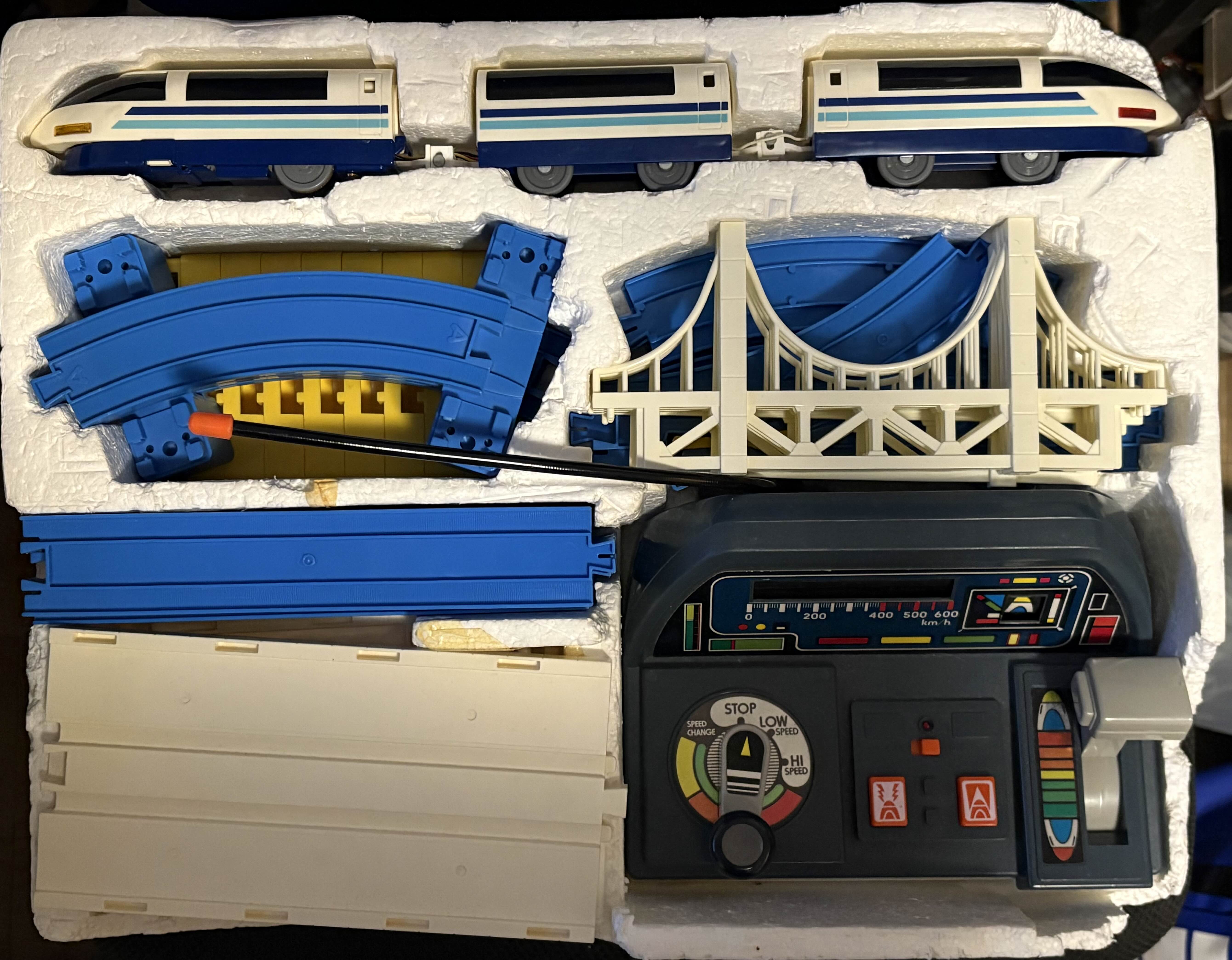 日本経済が絶好調となったバブル時代。その豊かさはおもちゃ業界にもおよび、これまたバブルの賜物と言える未来の新幹線「スーパーひかりモデル」がプラレール化され、そのインパクトの強さや期待を込めた気持ちがこのようなセットを生み出しました。