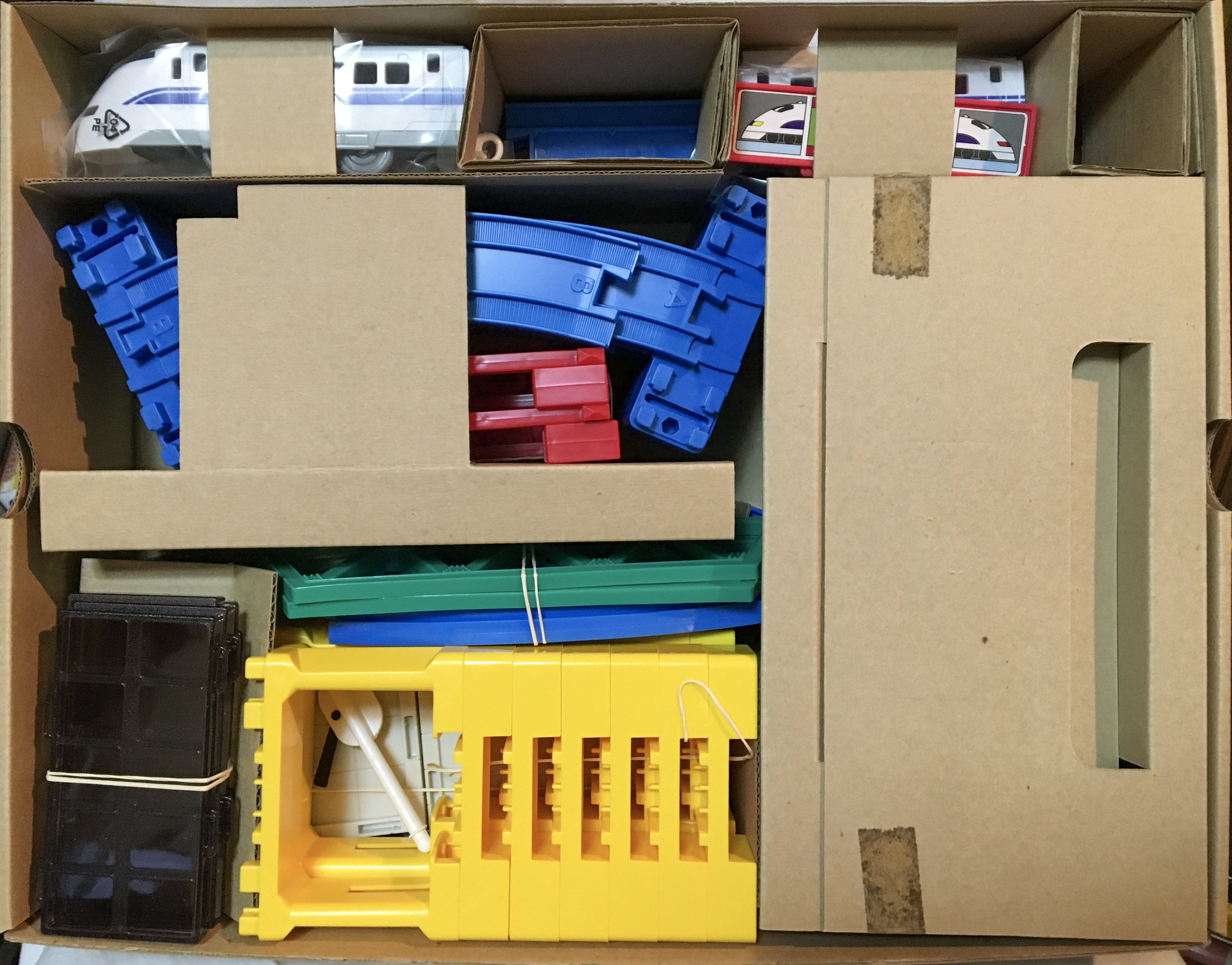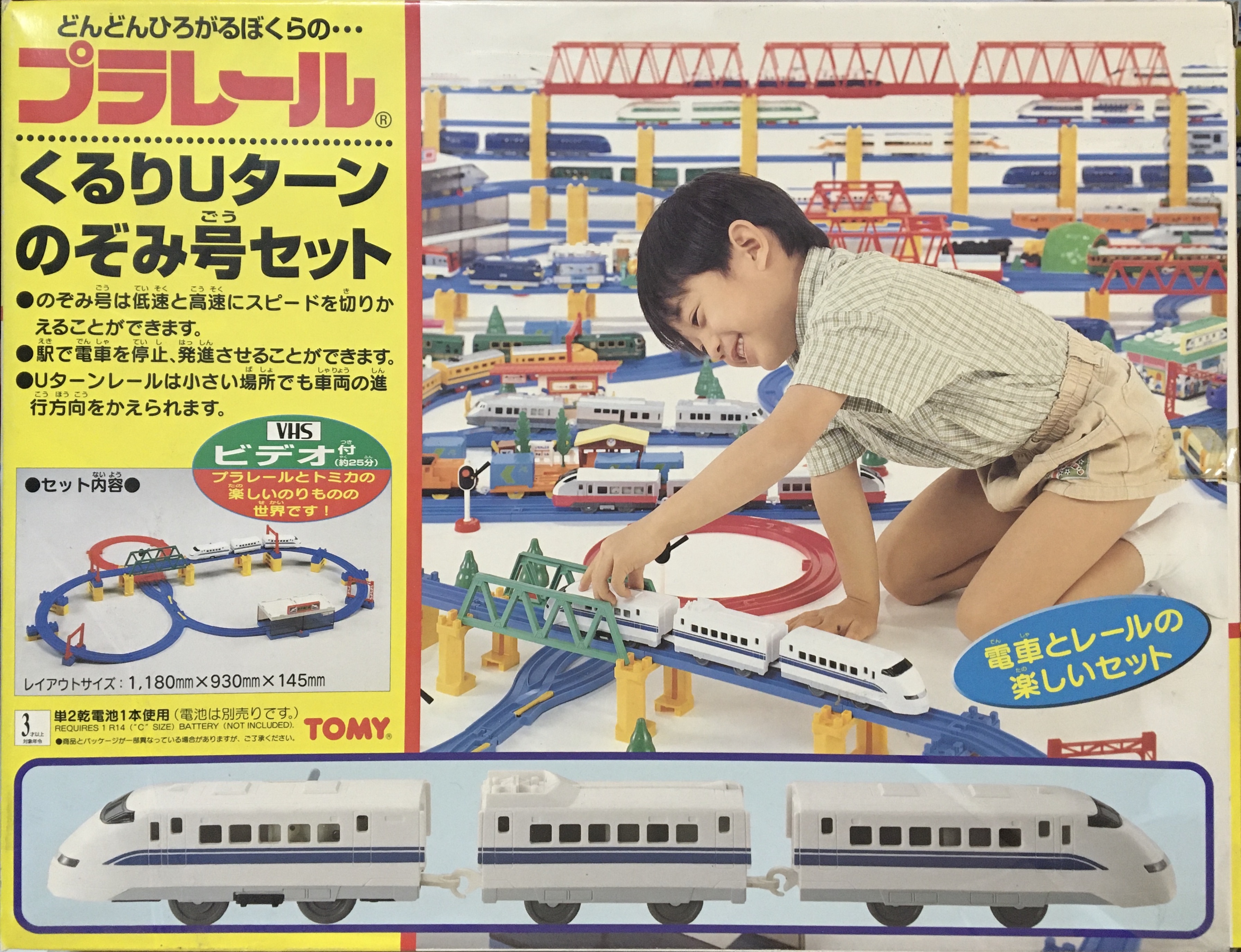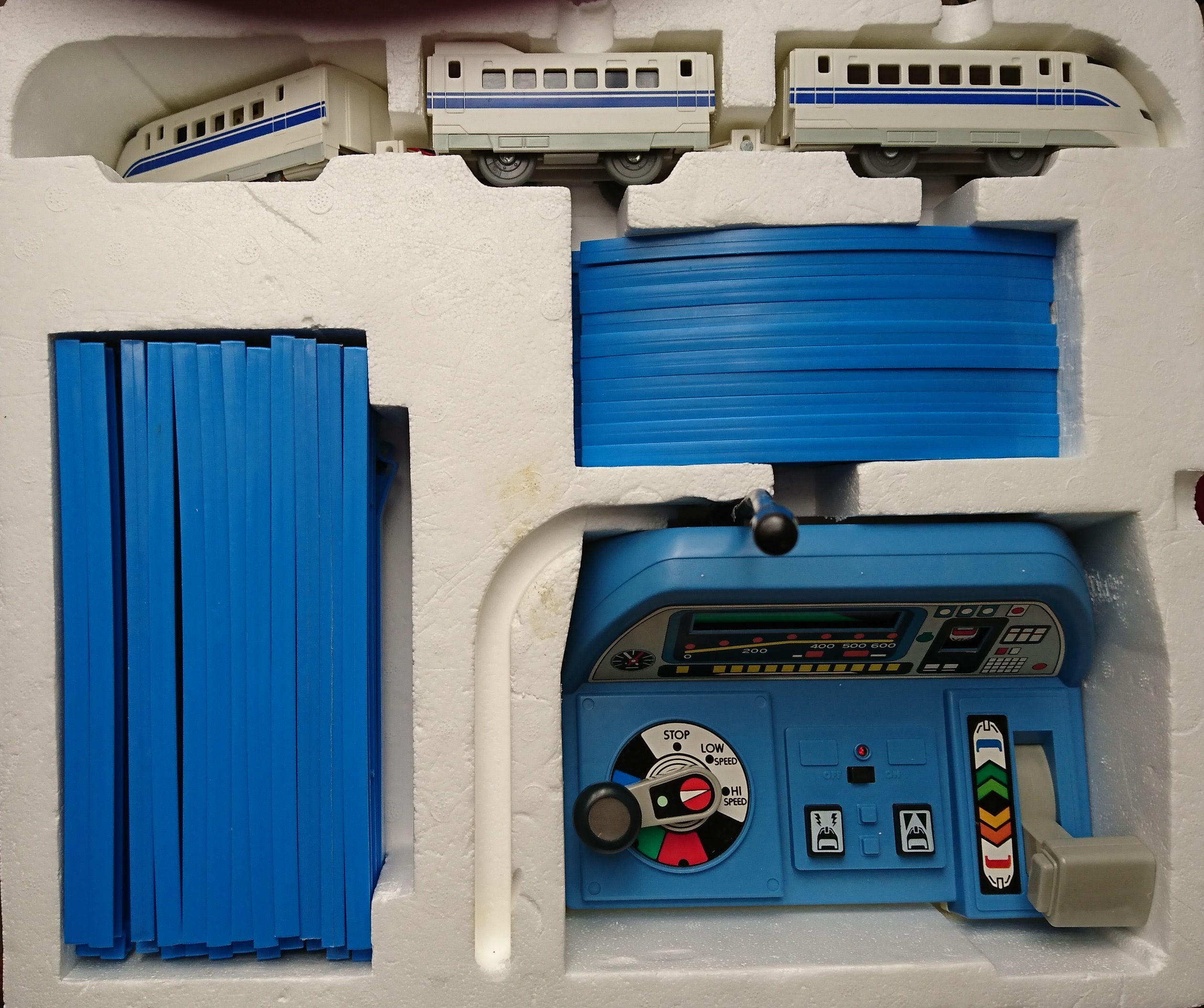 1992年に発売された「ぼくがうんてんする リモコンのぞみ号セット」の後身。基本レイアウトは変わりませんが、駅・架線柱・鉄橋が無くなり、完全平面となりました。内容物の削減で収納容器もコンパクトになりましたが、その分高さが増したため、のぞみ号の先頭車のみ下向きに折れ曲がる形で入っているのが特徴です。