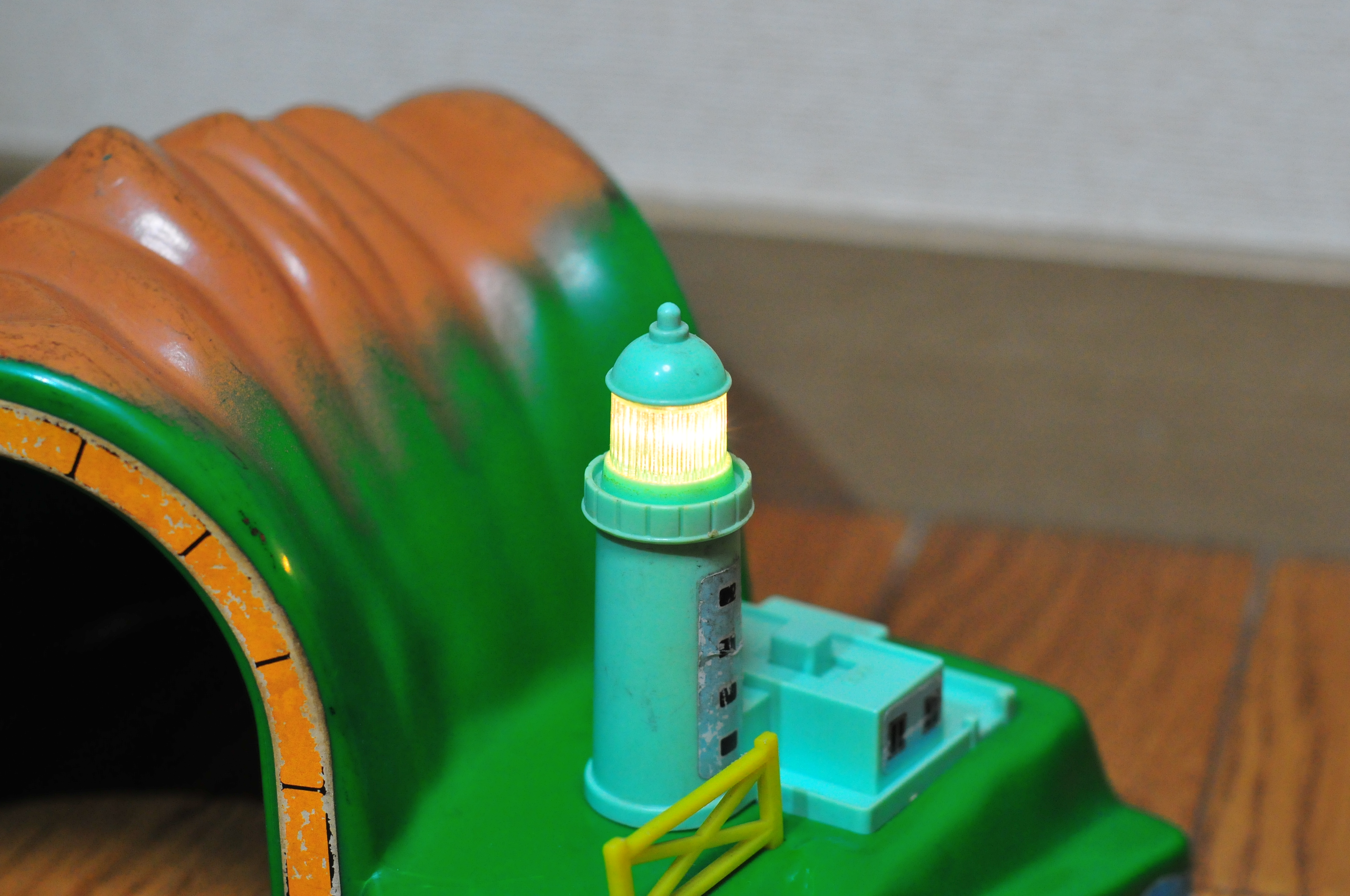 の姉妹品。電池を入れると一定間隔で点滅し、灯台の光を表現するギミック系情景です。 1986年に絶版。いなかのトンネル共々