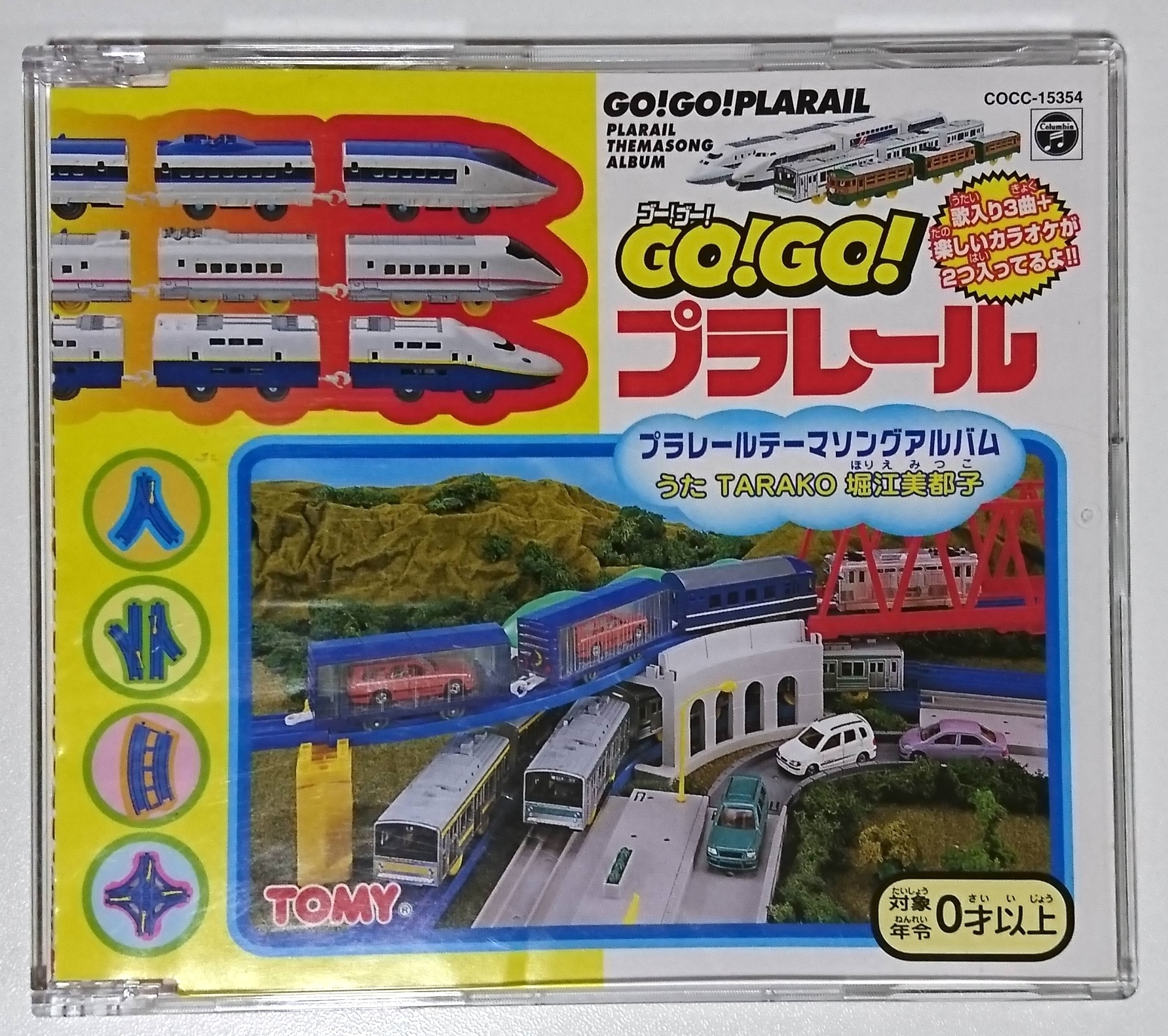 「プラレールテーマソングアルバム」と称されるCD。TARAKO歌唱の「プ!プラレール」「鉄道的哀歌(でんしゃぶうるす)」のボーカル版・カラオケ版と、堀江美都子歌唱の「進め!冒険アスファル島」の5曲が収録されています。しかし「鉄道的哀歌(でんしゃぶうるす)」とは、子供向けにしては渋すぎるタイトルですね。ジャケットの「対象年令0歳以上」というのもそれはそうだろうという感じで面白いです。